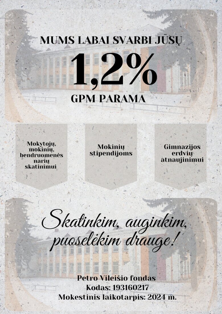 - 2019 m. pakeistas gyventojų pajamų mokesčio (GPM) tarifas, todėl pasikeitė ir gyventojų paramai skiriamos GPM dalys - galima skirti 1,2 %