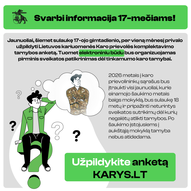 Visi Lietuvos jaunuoliai, kuriems šiemet sueina 17 metų, ne vėliau kaip per vieną mėnesį po gimtadienio privalo užpildyti Lietuvos kariuomenės Karo prievolės ir komplektavimo tarnybos anketą dėl tinkamumo karo tarnybai. Tai yra būtina tam, kad būtų užtikrintas sklandus karo prievolininkų šaukimo procesas, kai jie bus įtraukti į 2026 metų karo prievolininkų sąrašą.