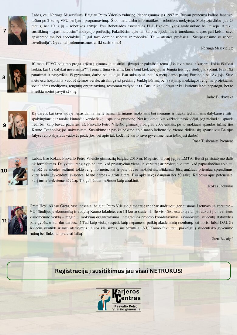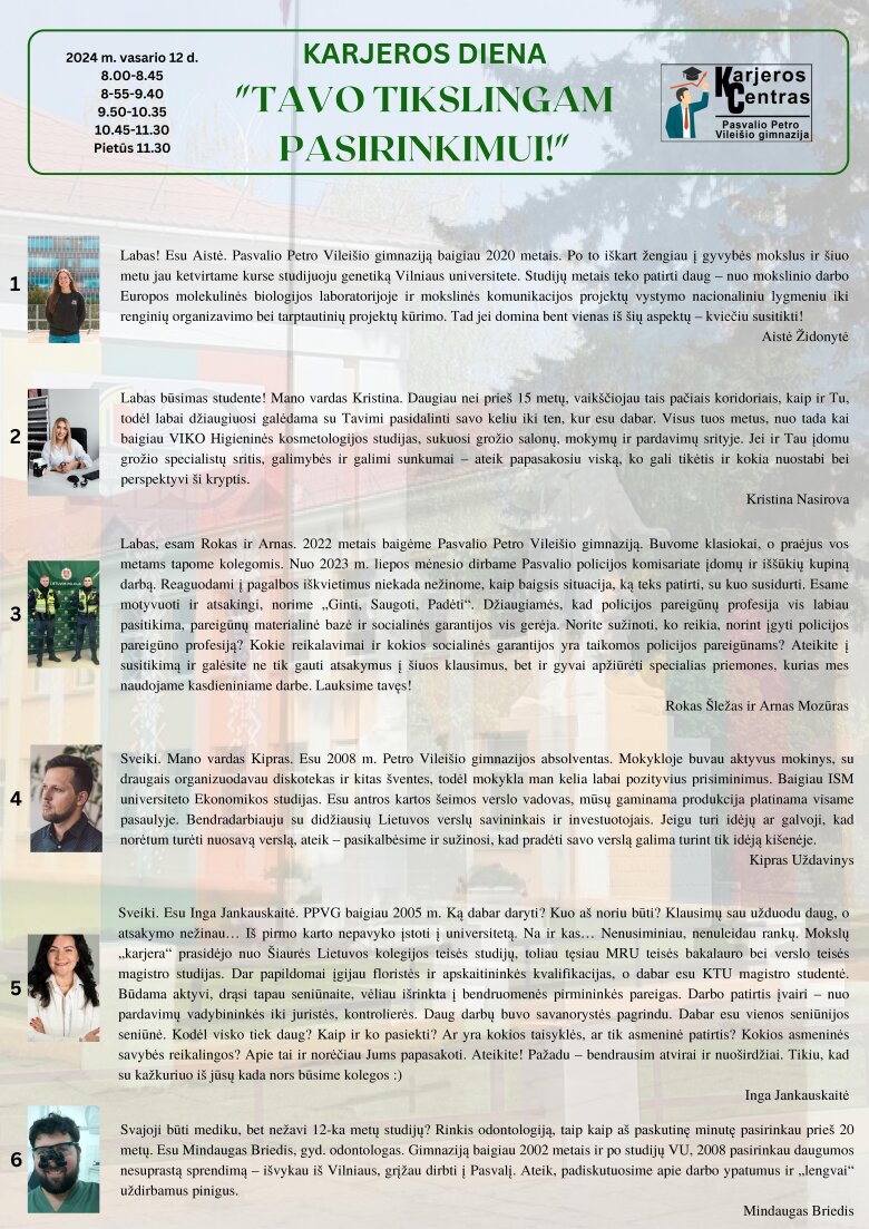 Kviečiame vasario 12 dieną gimnazijoje praleisti prasmingai - domintis ateities galimybėmis Karjeros dienoje! Visi gimnazijos mokiniai registruotis į renginį galės vasario 5 dieną, pirmadienį, klasės valandėlės metu. Detaliau susipažinti su renginio programa ir Karjeros dienos dalyvių aprašymais galite: