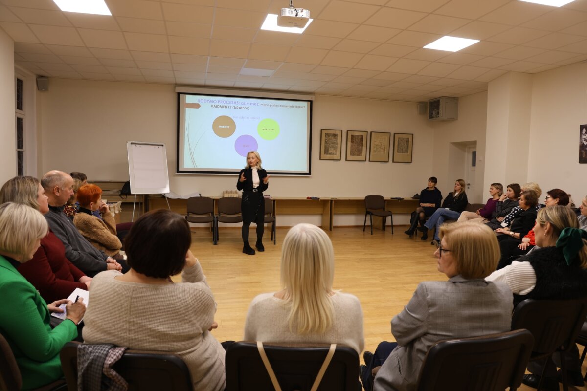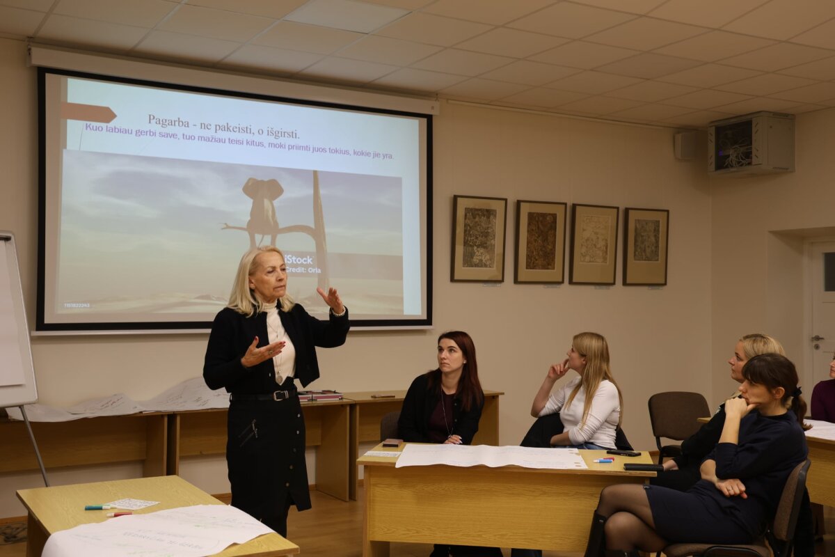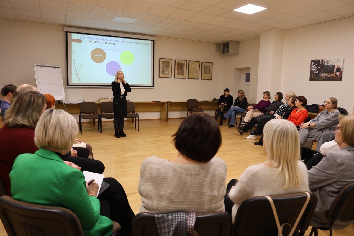 Lektorė kalbėjo apie mokytojo vidinę būseną, savivoką, emocinį sąmoningumą ir tai, kaip šios savybės daro įtaką santykiams klasėje. Ji dalijosi įkvepiančiomis patirtimis, akcentavo mokytojo profesijos prasmę ir drąsino atsigręžti į save – į savo vertybes, motyvaciją ir žmogiškumą.