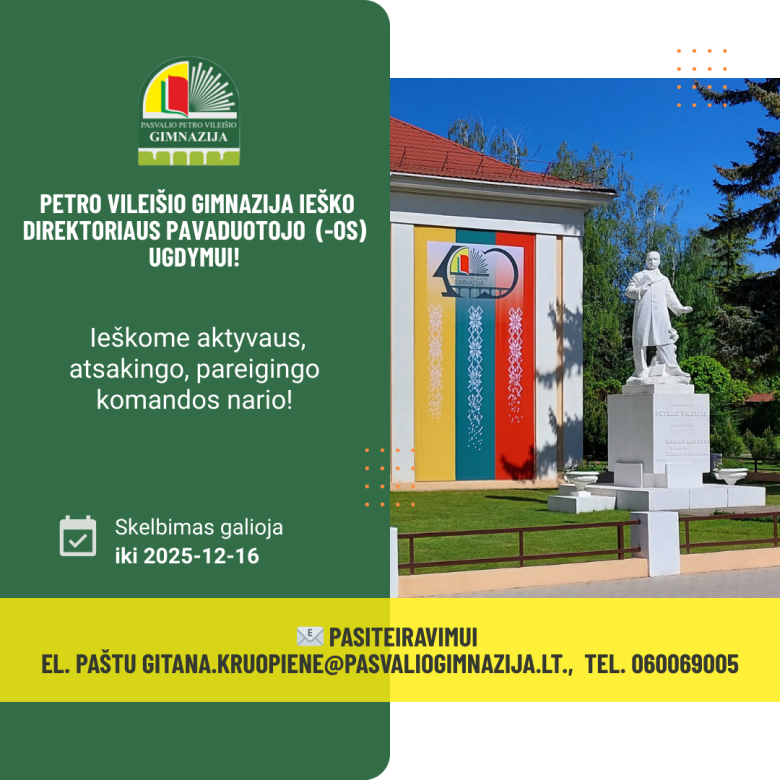 Pasvalio Petro Vileišio gimnazija ieško aktyvaus, atsakingo pareigingo komandos nario - Direktoriaus pavaduotojo ugdymui.